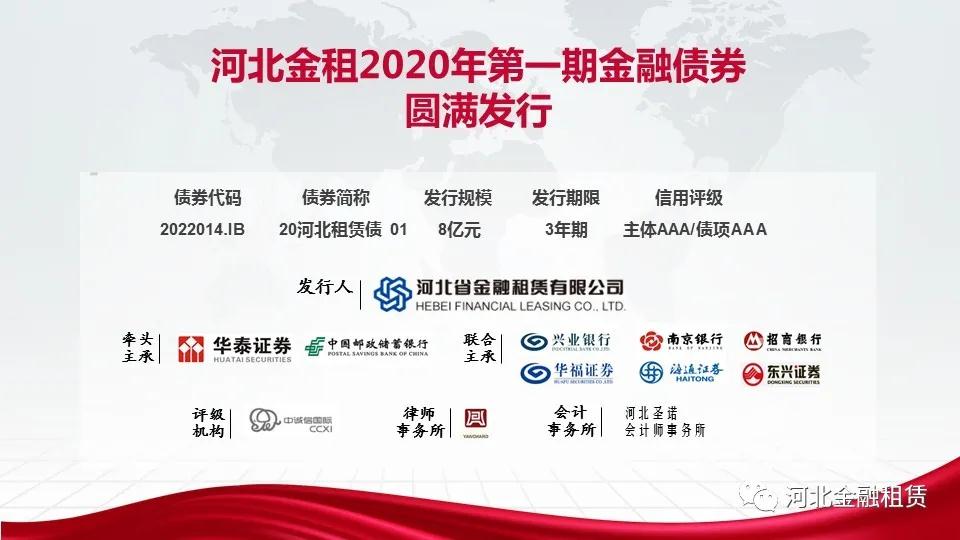 日前,河北省金融租賃有限公司(以下簡(jiǎn)稱“河北金租”)2020年第一期金融債券成功發(fā)行,發(fā)行規(guī)模8億元,期限3年。此次河北金租發(fā)行的金融債券場(chǎng)內(nèi)認(rèn)購(gòu)倍數(shù)達(dá)到2倍,投資人認(rèn)可度較高,債券所募資金將主要用于清潔能源、節(jié)能環(huán)保、醫(yī)療健康等公司戰(zhàn)略行業(yè)項(xiàng)目投放,同時(shí)積極助力新冠肺炎防控,為防疫醫(yī)療設(shè)備商和服務(wù)商、新冠疫情定點(diǎn)醫(yī)療機(jī)構(gòu)提供金融服務(wù),支持湖北等地區(qū)公共事業(yè)及工程裝備制造等行業(yè)發(fā)展。